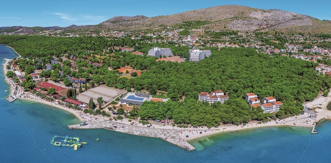 areál na brehu mora na miernom návrší v píniovom lesíku v dedinke Seget Donji • len 4 km od starobylého Trogiru • vzdialenosť hotelovej budovy od pláže cca 150 m • areál lemuje pobrežná promenáda a kamienkové pláže kombinované s vybetónovanými plochami v dĺžke viac ako 250 m • ležadlá a slnečníky na pláži pred hotelom (za poplatok)