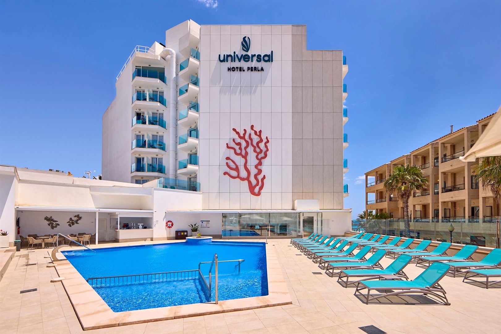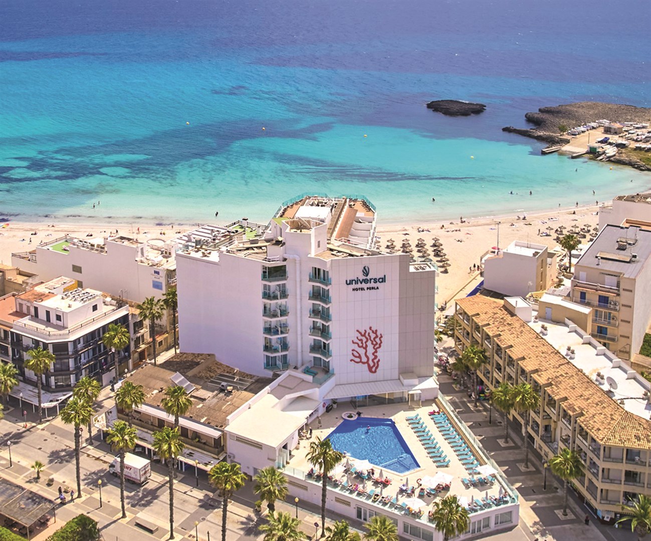 Hotel renomovanej švajčiarskej siete Universal sa nachádza v stredisku S´Illot, priamo na pláži, kde sa odtiene tyrkysovo modrého mora vynímajú pod hrejivými lúčmi slnka. Dychberúci výhľad z hotelového sky baru, čerstvo pripravené jedlá v all inclusive reštaurácii, trblietavý bazén s pool barom a širokou ponukou drinkov vo vás iba umocnia pocit, že ste si vybrali správnu dovolenku.