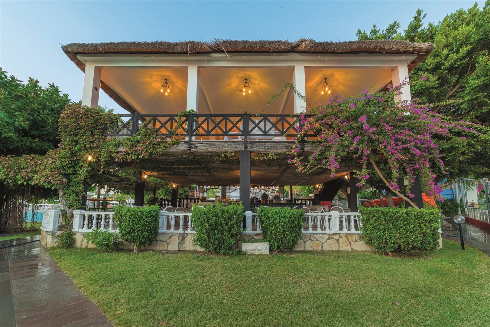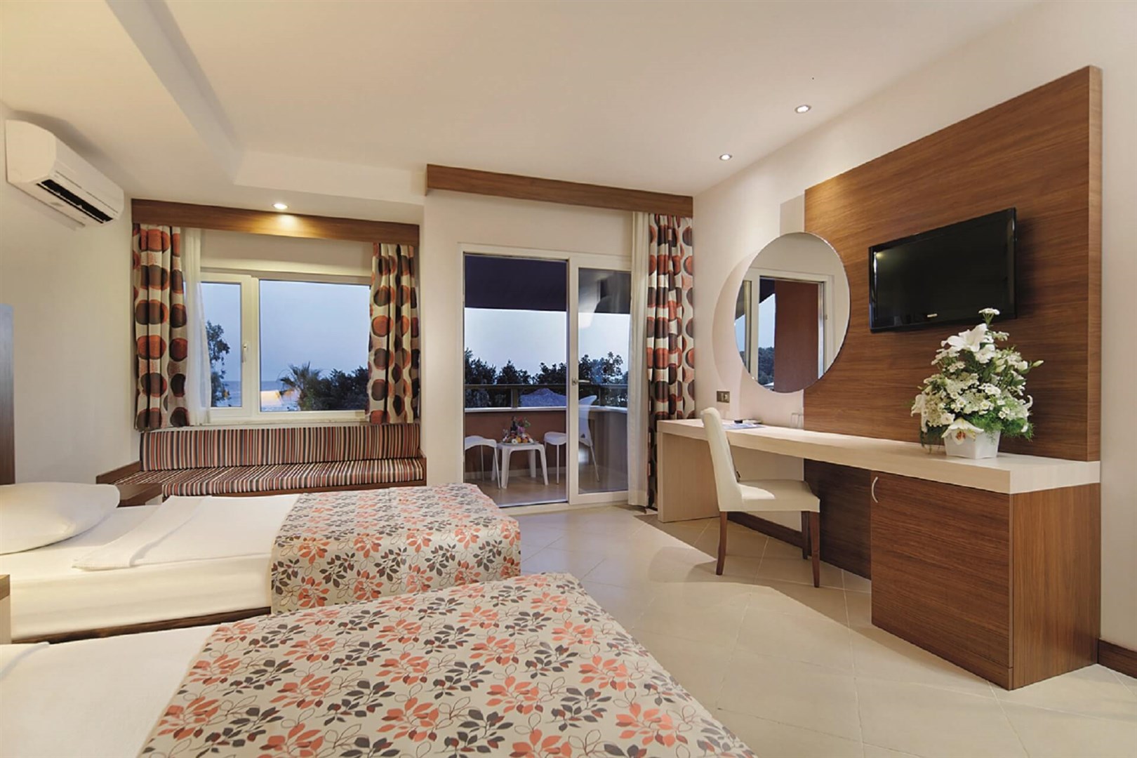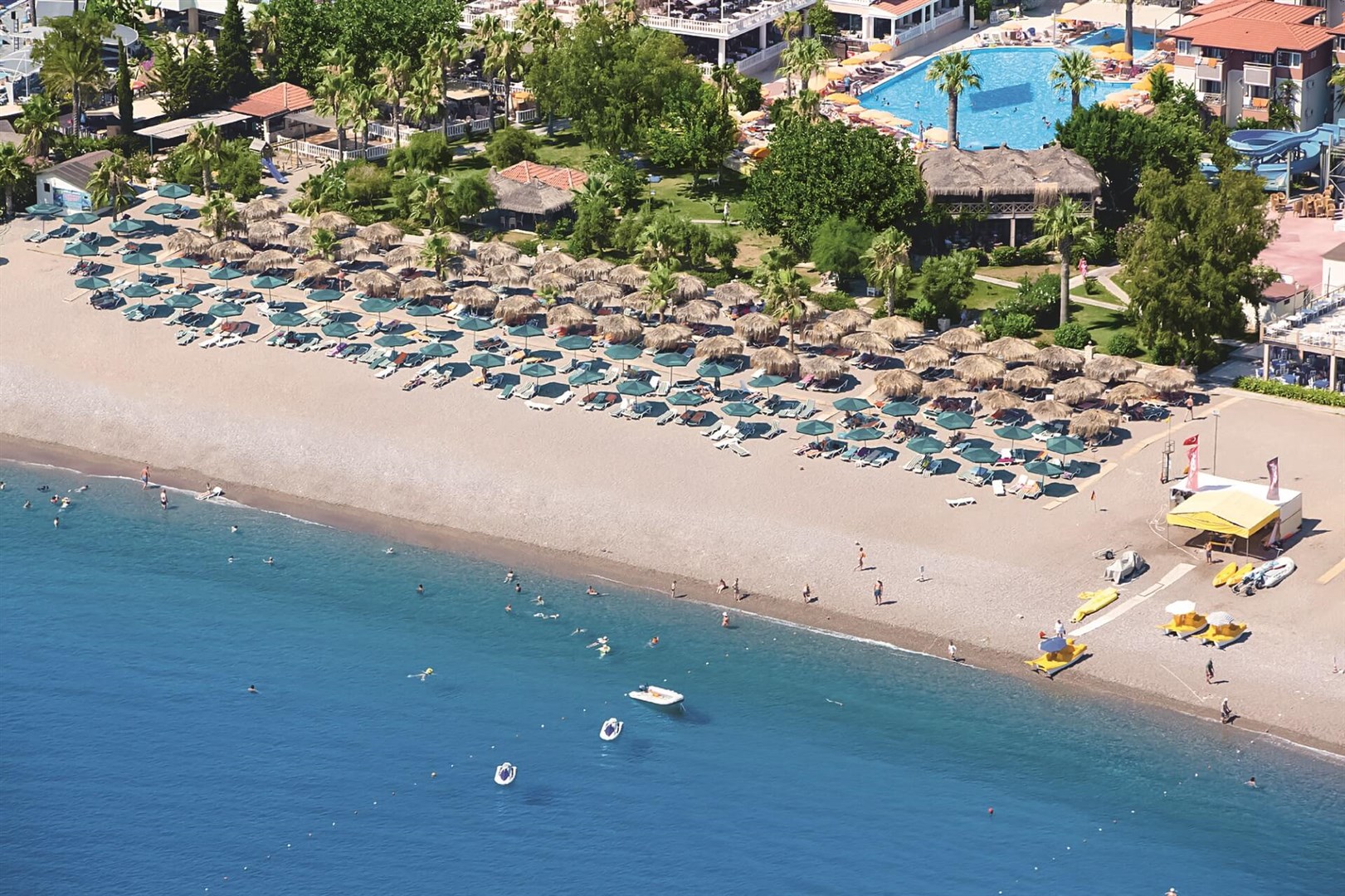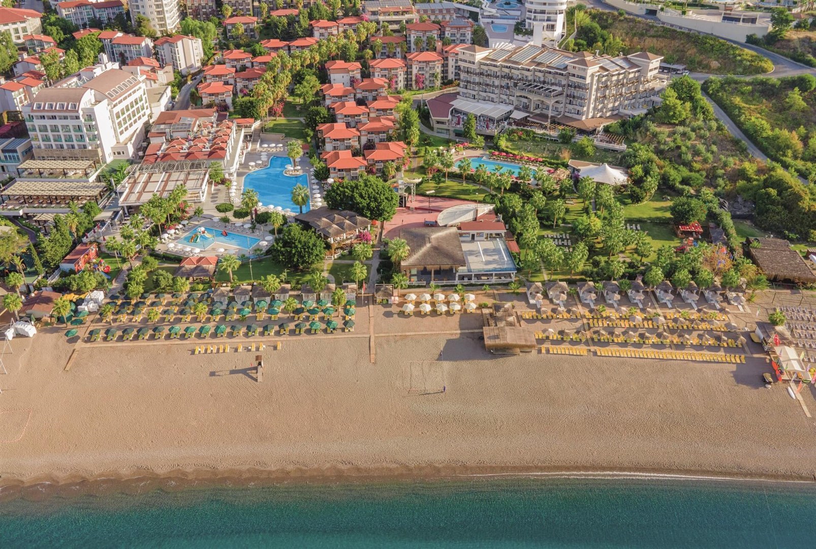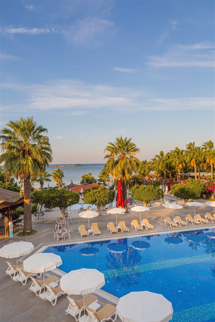 Rodinný hotel pozostáva z hlavnej budovy a viacerých poschodových viliek, vsadených do jemne sa zvažujúceho areálu plného paliem. Malebné chodníčky vedúce zeleným areálom vás zavedú priamo k rozľahlej a upravenej pláži, k bazénu s toboganmi či k rôznym zábavným a športovým aktivitám spojených s hotelovými animáciami, ktoré spestria vaše dovolenkové chvíle.