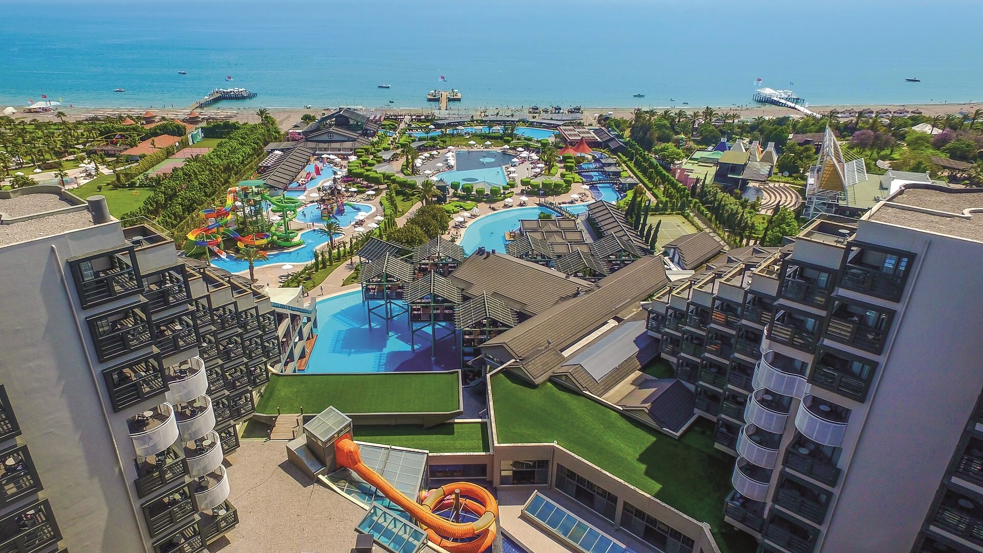 vstupná hala s recepciou a posedením • hlavná hotelová reštaurácia • snack reštaurácia • 3 a´la carte reštaurácie • lobby bar • pool bar • beach bar • cukráreň • 3 vonkajšie bazény • 2 vonkajšie detské bazény • aquapark • vnútorný bazén • SPA a wellness centrum • sauna • fitness centrum • tenisové kurty • rôzne druhy športov a športovísk • detské ihrisko • vodné športy na pláži • miniklub • junior klub • medzinárodné hotelové animácie, živá hudba a večerné show • wifi